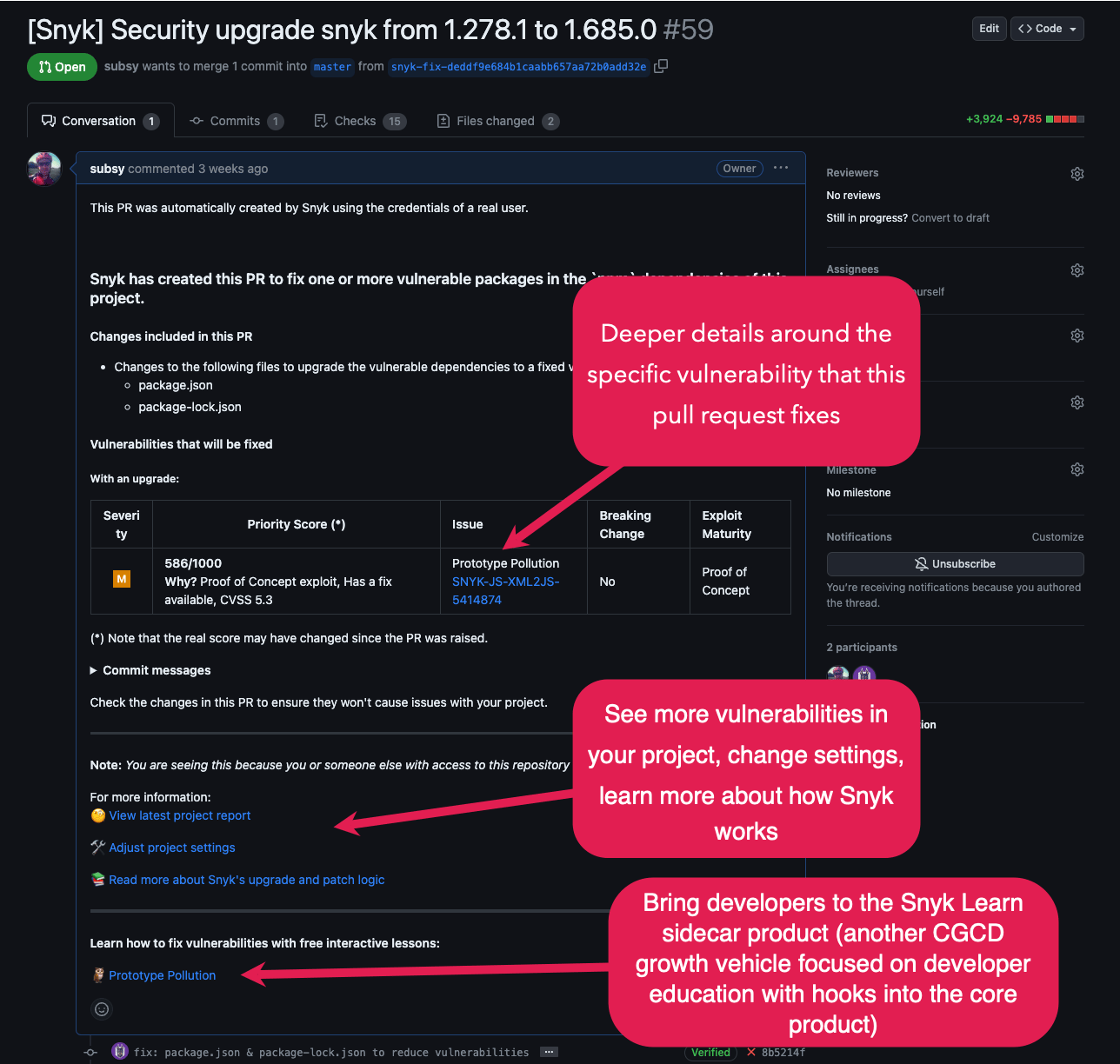 Developers see the Pull Requests, learn about Snyk and click a link to bring them to the product.