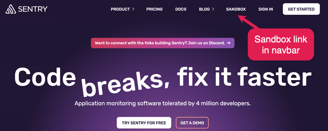 The interactive ‘breaks’ animation is quirky but also conveys the ease and speed of fixing that Sentry promises.
