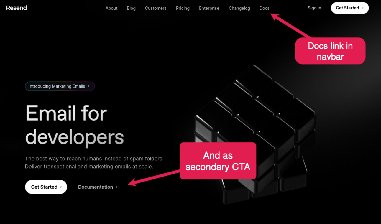Have your homepage do the essential early work of helping devs quickly understand the value you provide and delegate buyer messaging to supporting areas of the site.