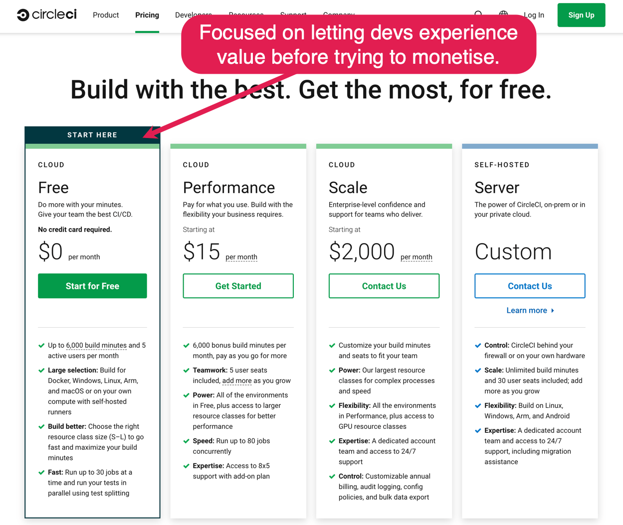 If they like your dev tool there are many things you can do to convert some of them to paid plans. But if they leave that pricing page and go with some other free tool, you are not converting anyone.