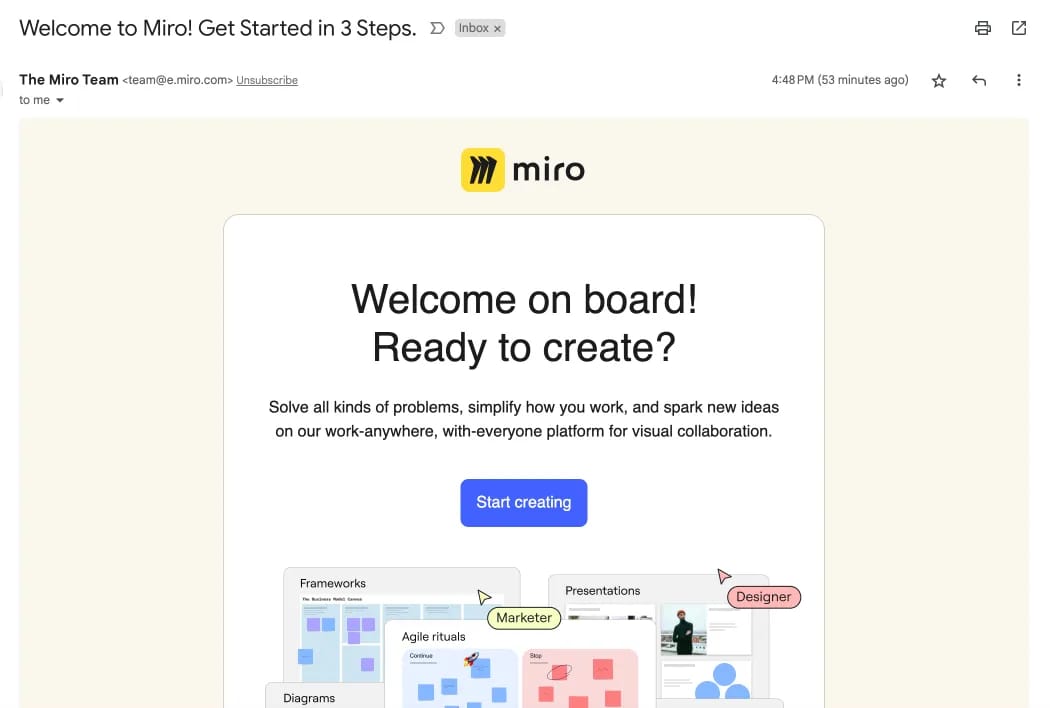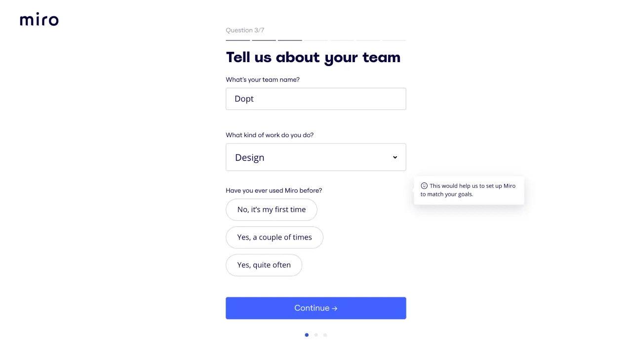 Miro asks users a series of questions to better understand them. Bonus! They say they'll provide better experiences based on the answers.