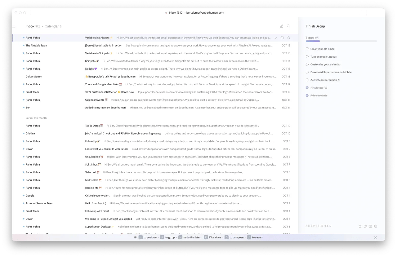 Superhuman started out hand-onboarding customers to get rich insight into their deepest pain points, jobs to be done, and aspirations with email — all while brand-building and driving deeper engagement. During each onboarding, we captured key bugs, feature requests, and notes for what we'd eventually turn into our self-serve product onboarding
