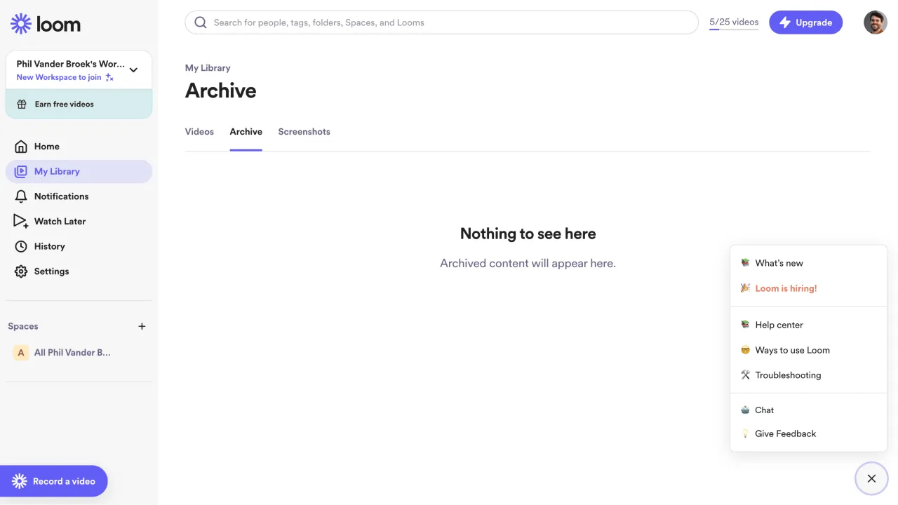 In our web app, Loom users can access our Help Center, reach out to Support, or give feedback within the same entry point. It's not only provided a persistent mechanism for users to self-serve help and documentation, it's also enabled our Support team to scale.