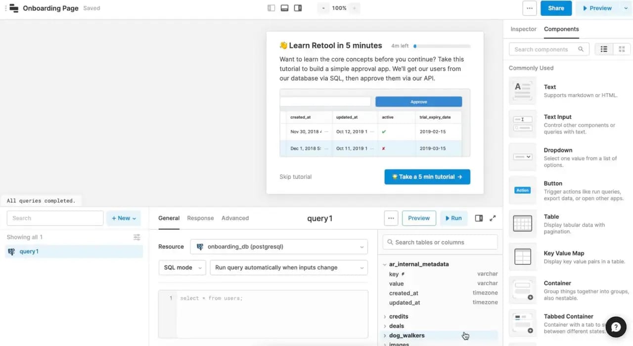 Retool has an interactive tutorial that helps the user take action to create their first internal app. It's entirely scripted but in their core builder experience.