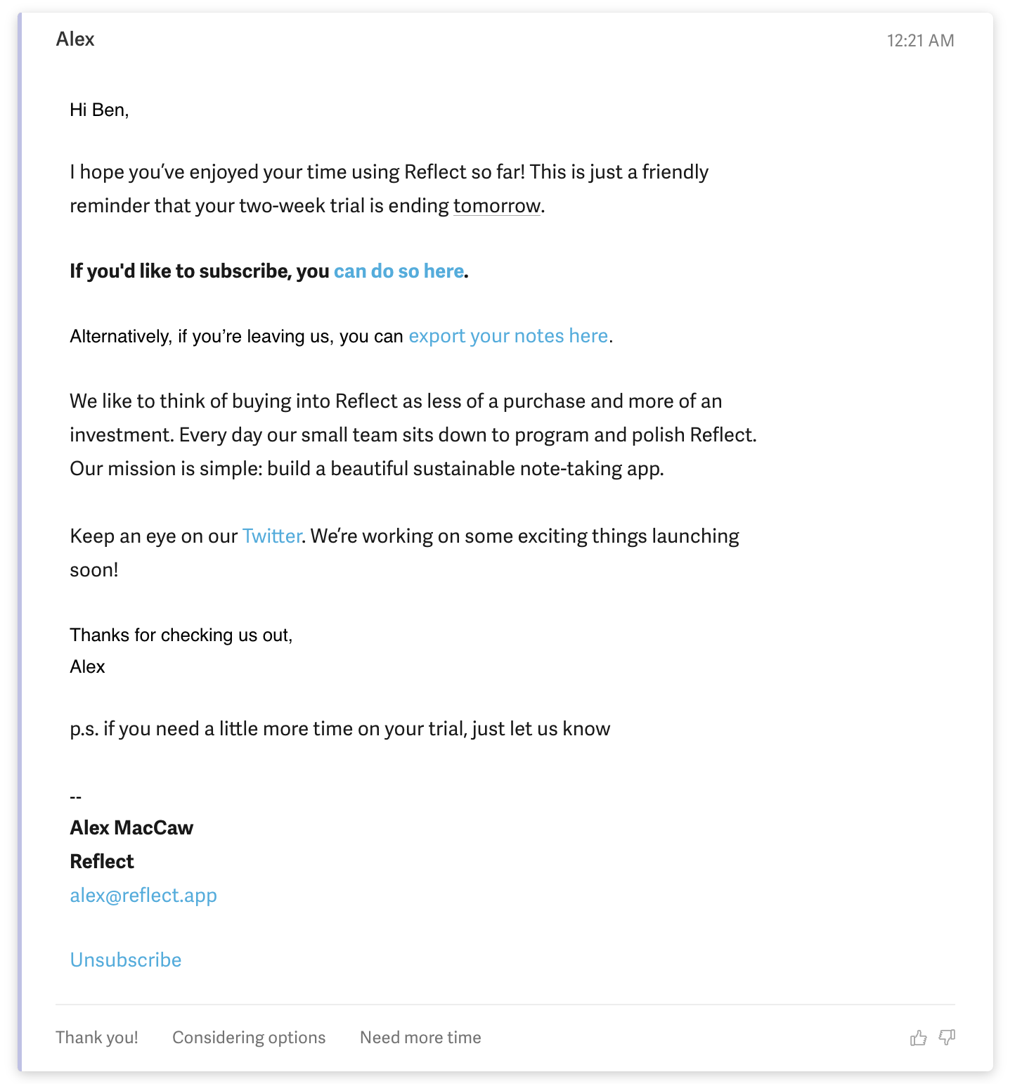 Real-world example: During free trials, Reflect sends a sequence that starts with helpful onboarding, transitions to highlighting specific valuable features, and concludes with "trial ending" reminders. The messaging evolves from educational to more sales-oriented (though not overtly pushy) as the trial progresses.